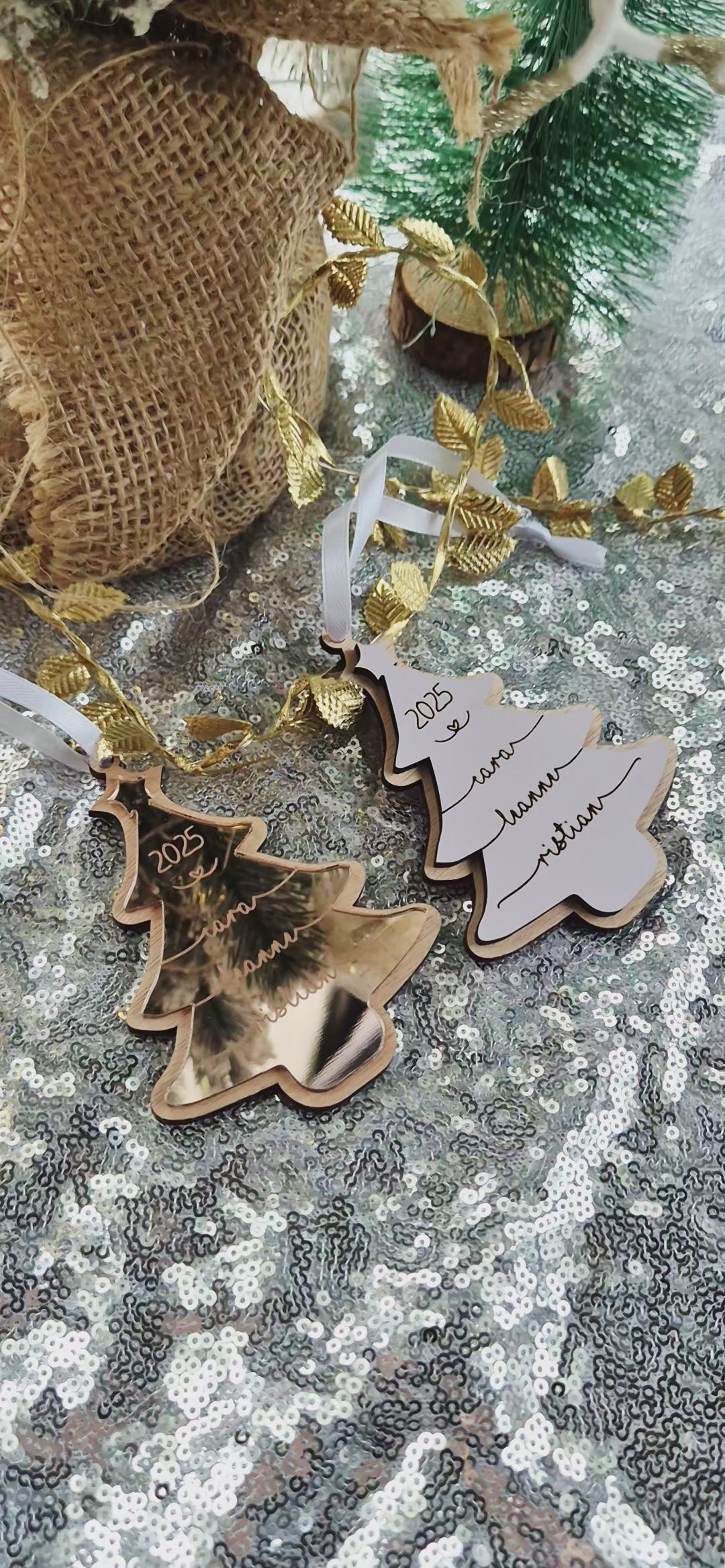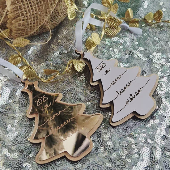Celebrate your family and the spirit of the season with this stunning Personalized Family Tree Ornament. Beautifully crafted with a layered design, this keepsake combines the warmth of wood with the modern elegance of mirror or colored acrylic.