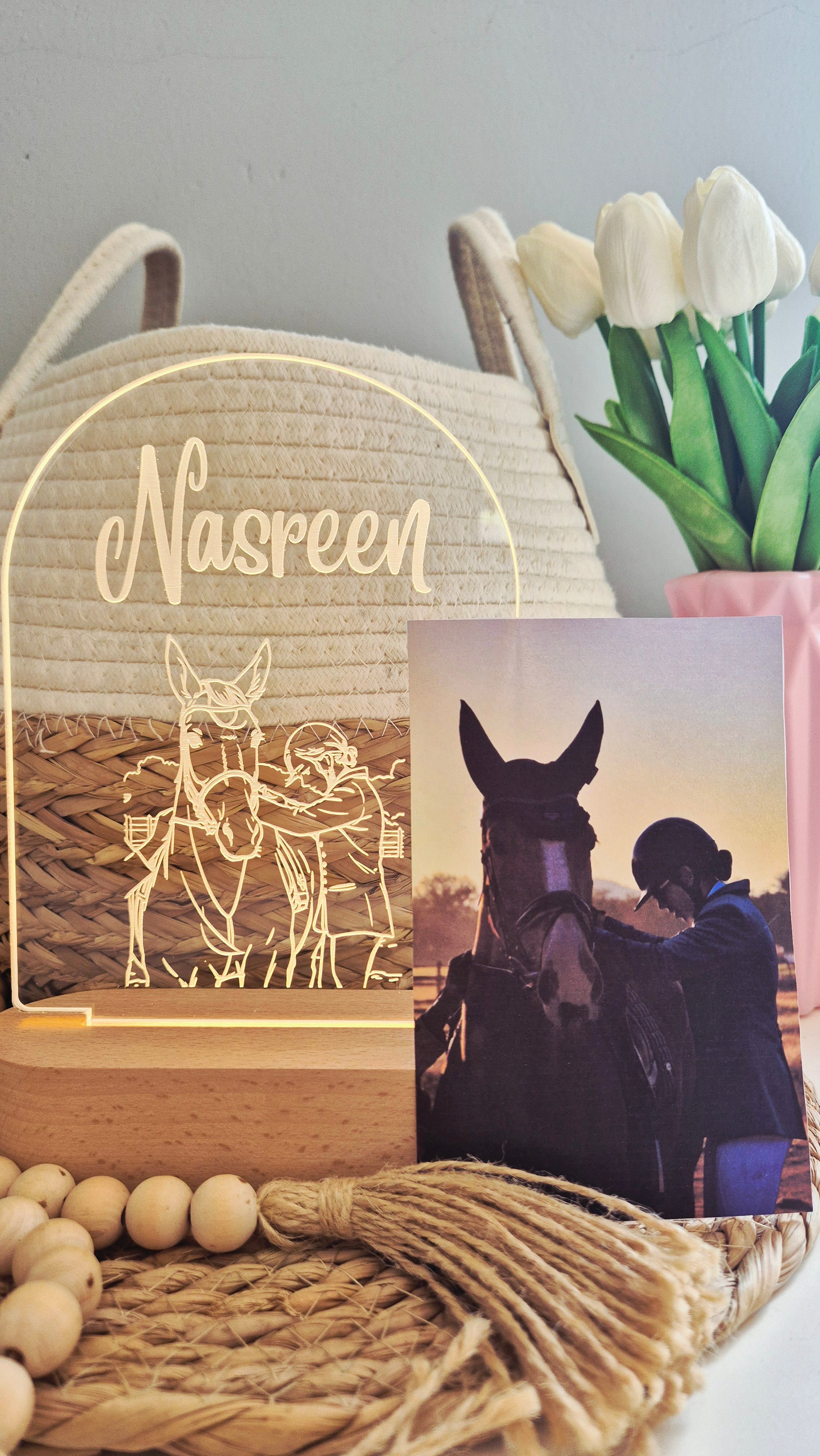 This custom LED lamp transforms your picture into a delicate line drawing, beautifully engraved on premium acrylic and set on a natural wooden base. Perfect as a gift or a meaningful piece of décor, it captures memories in a warm, ambient light.